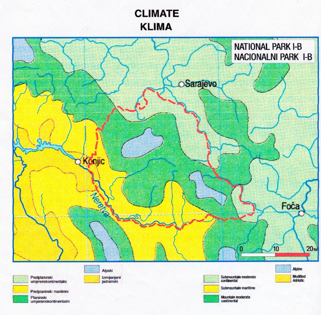 U Bosni i Hercegovini na maloj razdaljini se odvijaju nevjerovatini klimatski obrati. Dok na južnim padinama bosanskohercegovačkih planina cvjetaju kadulja, nar i bademi, sjeverne strane planina su pod dubokim snježnim pokrivačem. Tako naprimjer zamišljeni nacionalni park Igman, Bjelašnica, Treskavica, Visočica ima pet klimatskih zona: Izmjenjenu jadransku, Predplaninsku maritimnu, Predplaninsku umjerenokontinentalnu, Planinsku umjerenokontinentalnu i Alpsku na vrhovima planina.